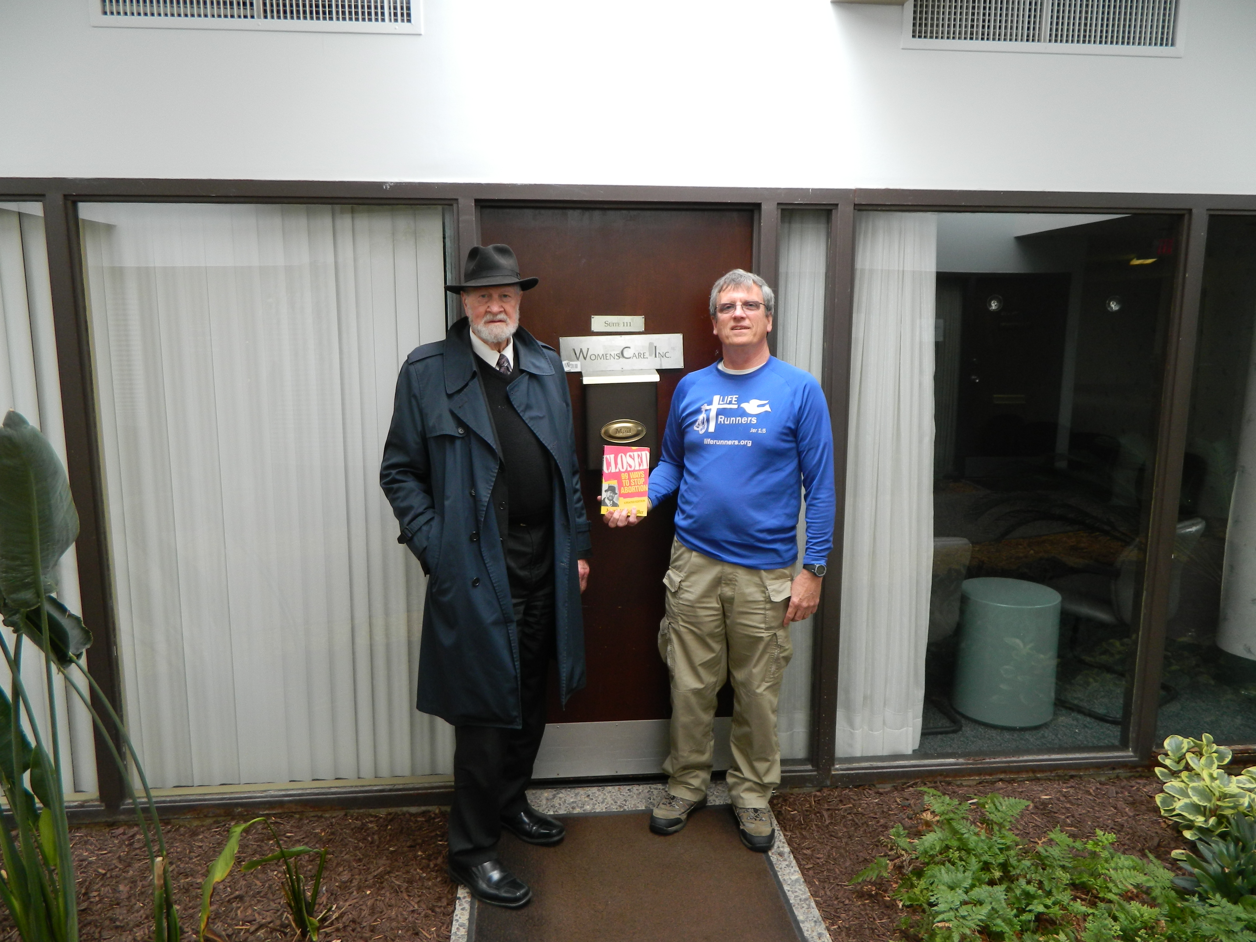 Inside were the new owners. Soon one was outside. Eric Harris. I explained that it used to be an abortion mill. He said he was told it was a medical office and that the owner was unable to sell it for the longest time. I asked if he was a believer, recommending his pastor come to pray over the site. He said theirs is a Christian group and one of the owners IS a pastor. It seems God decided to forgo my idea of the bulldozer and instead bring His blessing upon this terrible site. To sanctify this desecrated ground with His work. The owner retrieved the old nameplate for the mill and took our pictures. We had a most amazing visit. Closed WomenScare 2014 Joe & John (2)